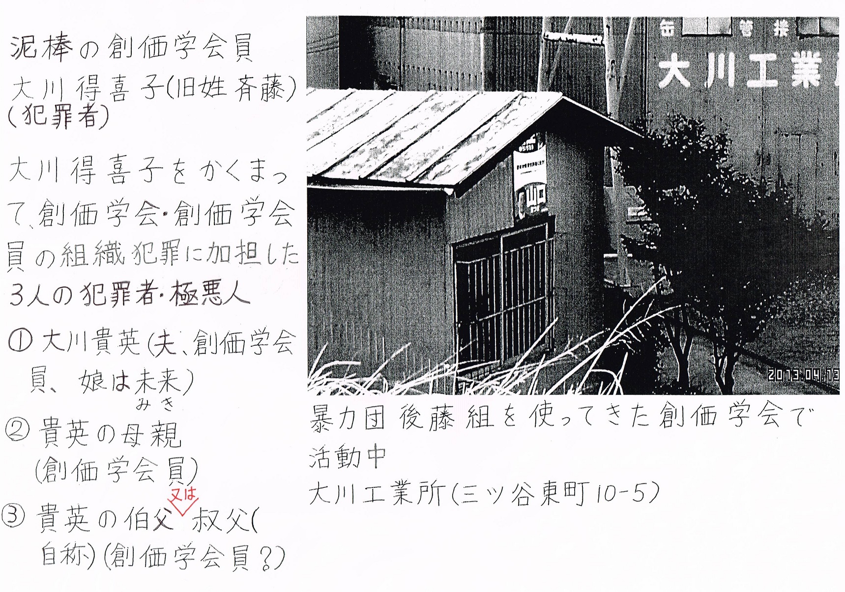 創価学会の財務(寄付)。創価学会・創価学会員(大川得喜子、板谷幸志、野呂吉人)は、人の不幸に付け込んで、入院中の重度障害者(斉藤広宣、創価学会員)から1,500万円を奪った。完全犯罪。 創価学会・創価学会員の犯罪・悪事の特徴は、組織で、多人数で、卑怯な手口で行う。