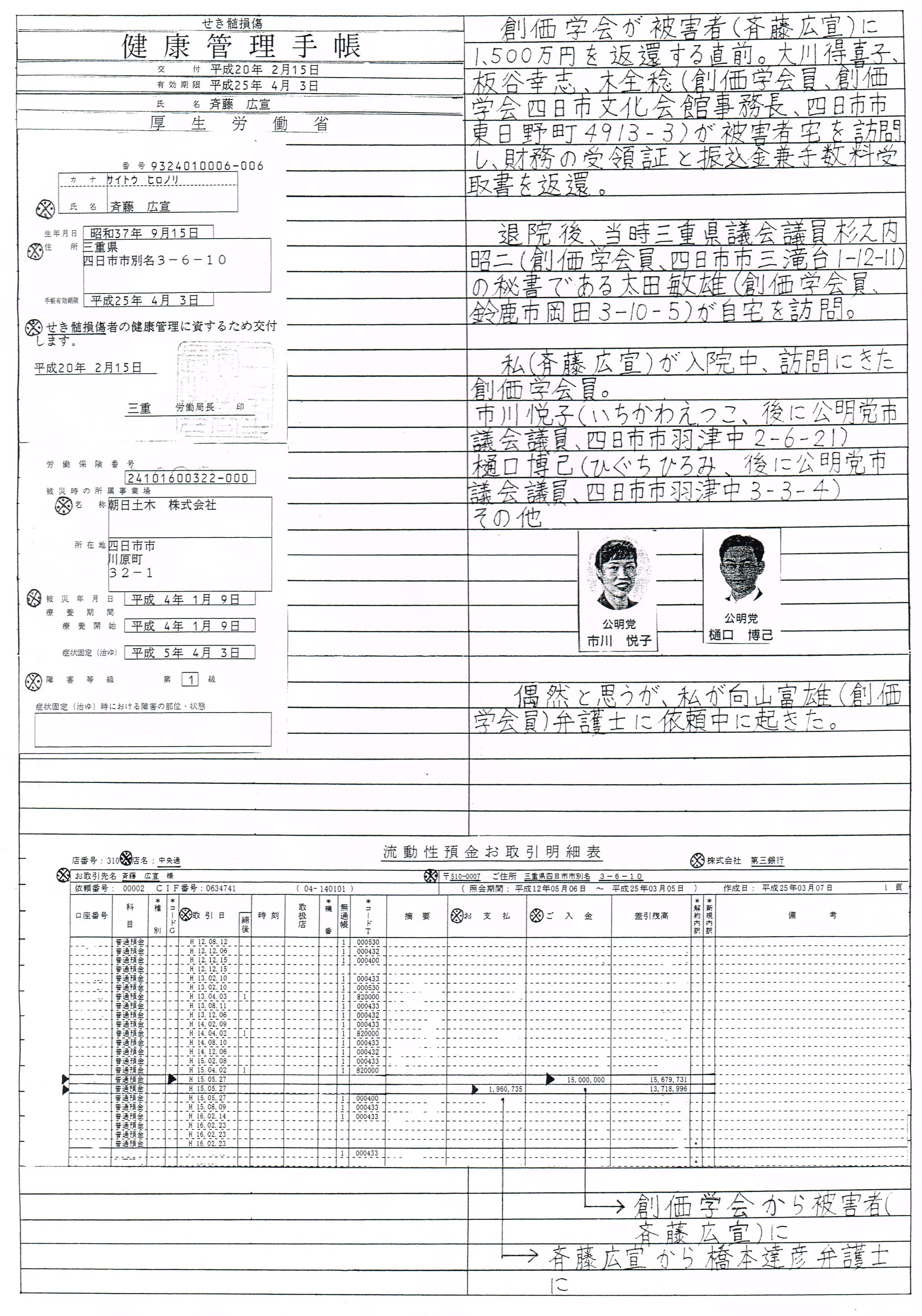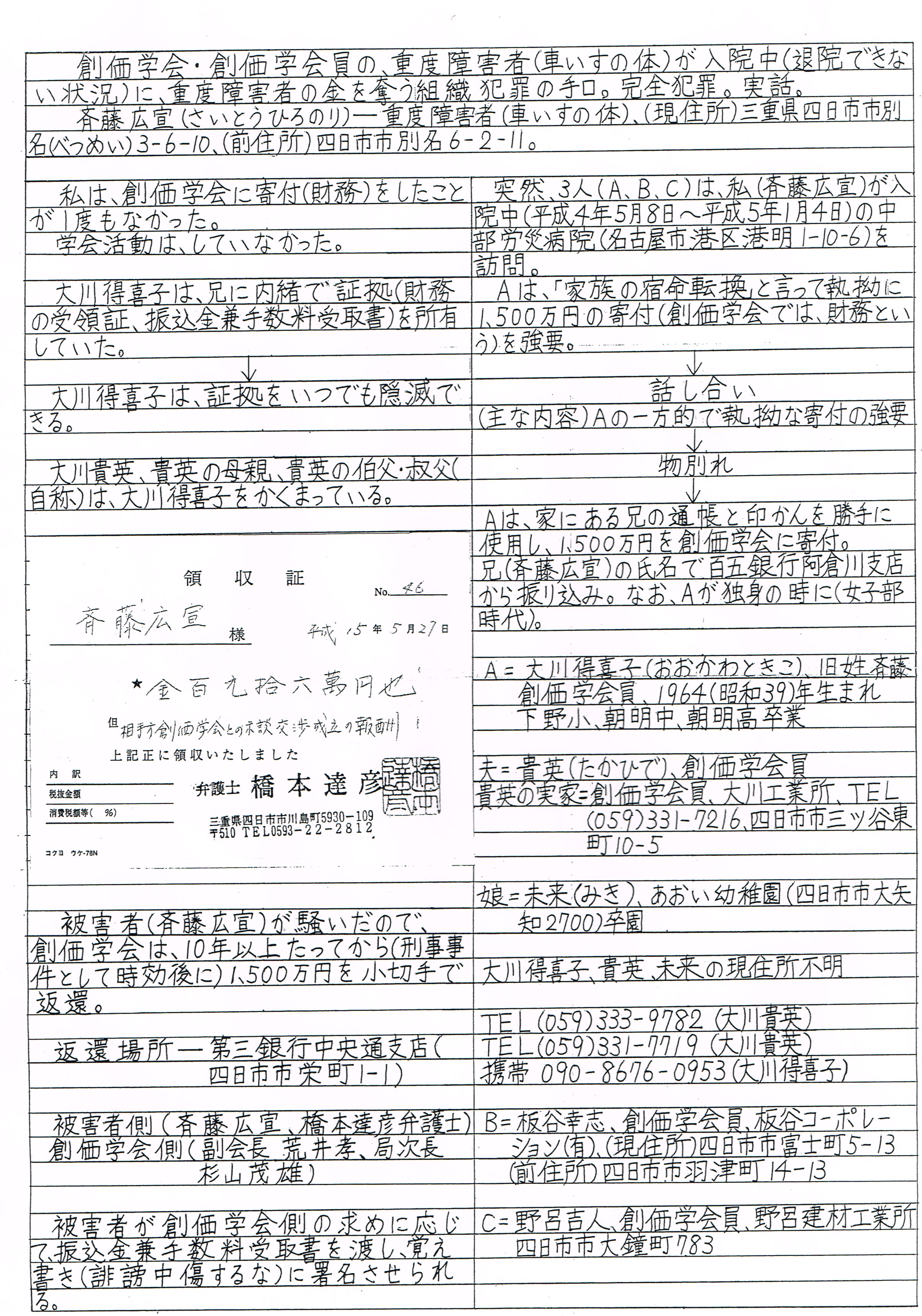 Aは、家にある兄の通帳と印鑑を勝手に使用し、1500万円を創価学会に寄付。兄(斉藤広宣)の氏名で百五銀行阿倉川支店から振り込み。なお、Aが独身の時に(女子部時代)。